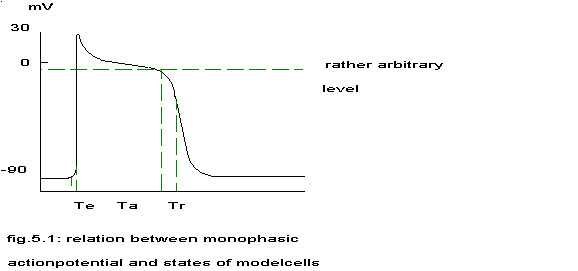 Specially built delay lines were needed for the states: “excitation”, “activity” and “refractoriness”. The first three states had fixed delays of resp. 4, 120 and 24 msec, the last state had a variable delay depending on the overall activity, a maximal refractory period K and a ‘influence factor’ F (F <= 0). These times and factors were based partly upon the pictures published by several authors (Sano 1958, Krinsky 1973, Rushmer 1976, Cranefield 1975) and partly upon preliminary experiments with the CSMP model to find a stable continuous activity pattern. The relationship with the monophasic actionpotential is sketched in the next figure.