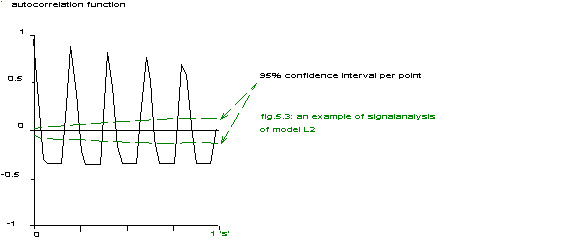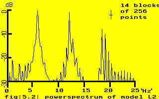 The normally quiescent model was brought to activity by gradually bringing a fraction of 0.0135 of the total population of 1000 cells into the active state every timestep during 74 timesteps of 2 msec’s. The rationale behind this is that it seems very unlikely that myocardial cells will have exactly the same refractory period and that stimulation of the heart with the high frequency of 50 Hz will bring all cells in a different phase in their cycle of stimulated activity. Zipes stated: “If the degree of electrical asynchrony is sufficiently great, then simply increasing the ventricular rate beyond the ability of all myocardial elements to follow in a uniform fashion will begin fibrillation.” (Zipes 1975) No stimulus whatsoever has been given after the first 148 msec. The reader can study this model in LumpedL2. In order to compare the output of this model with the experimental results every 20 simulated msec’s the value of the filtered first derivative of total activity was written to magnetic tape and analyzed in the same way as the recorded signals during ventricular fibrillation. The first derivative was chosen reasoning that an external electrode would measure a change in membrane potential rather than the spatial integral of all membrane potentials. The results of signal analysis are shown in