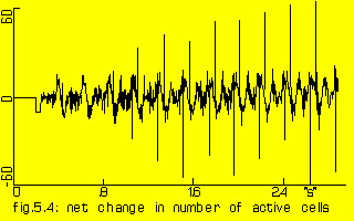 The other parameters were not changed and the model behaved at thresholds of 30 and 31 just as above. At threshold 32 the total activity diminished slowly during the 1000 simulation steps and the cells fired less regular. At threshold 33 all activity ceased after 888 steps and at 35 after 425 steps; the firing pattern was totally irregular. Although the aggregate showed no periodicity in its stable activity at thresholds 30 or 31, the number of cells that became active at each timestep ranged from 7 to 17 with an average of 12.