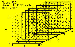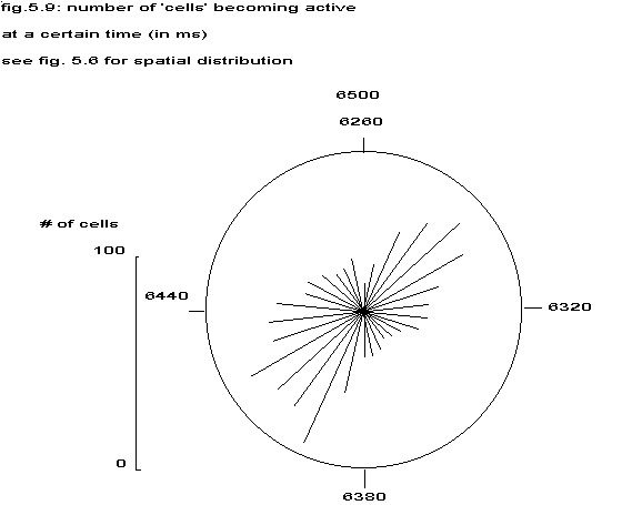 In fig. 5.6 the phases of all 1000 cells from timestep 3120 to 3240 are indicated by the slope of a small linepiece in such a way, that the moment of becoming active of a cell in that period is translated in an angle between 0 and 180 degrees, the vertical lines indicating step 3120 or 3240. The synchronization in two groups is easily seen, just as the many neighbouring cells in opposite phase, as indicated by their phase lines at right angles. The histogram of phases is shown in fig. 5.9.