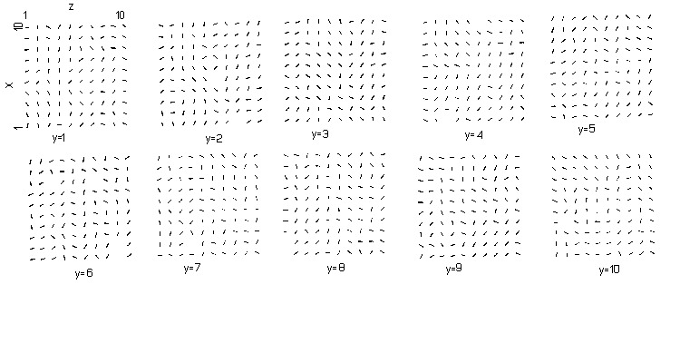 A general theoretical frame to analyze the behaviour of coupled, excitable, non-periodic elements is given by Winfree 1980. Practical considerations like available computer time and memory led to the construction of a model consisting of a three-dimensional array of 1000 cells (10�10�10). The essay of Fozzard 1979 on the conduction of the action potential in the heart establishes the anatomical feature called gap junction or nexus as the correlate for the electrical coupling between cells. The more nexuses, the stronger the coupling, see Plonsey 1974, Kensler 1977, Mann 1977, De Mello 1980, De Mello 1982a and De Mello 1982b. Based upon the anatomical data of Sommer and Johnson (Johnson 1967, Sommer 1979) the number of nexuses between cells was drawn from a binomial distribution, with a probability P and a size of 70. Tissue anisotropy and variation in junctions are sufficient for the necessary spatial variation; the assumption of variation in membrane properties is not necessary (Spach 1983). The cells are considered symmetrical and elongated in the X-direction; they have their nexuses only in the intercalated disks with a strong preference for the X-direction according to the following table: