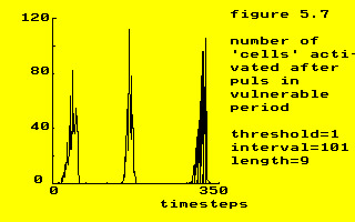 The 1000 cells of the model could not be uniformly distributed over the 82 possible phases at the start of simulation. To check the possibility that the observed variation was caused by the initial irregularity, the lengths of the periods were changed to 3, 76 and 100, so the proportions did not change too much and the 1000 cells could now be distributed over 100 phases. At a threshold of 30 this model showed an exact repetition period of 100 steps in individual cells, but the overall variation in number of cells that became active was still there. This variation was too irregular to impose a periodicity on the whole model and was caused by the fact, that after the initial activation some cells cannot become excited and/or active as not enough of their neighbours are active. After a few cycles however all cells in this network ran as fast as they can, although the threshold of 30 is higher than the average number of connections between the most strongly connected cells: 0.26�70 = 18.2.
