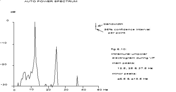 fig 6.10: intramural unipolar electrogram during VF main peaks: 12.5, 25 & 37.5 Hz minor peaks: ±6.5 & ±18.5 Hz