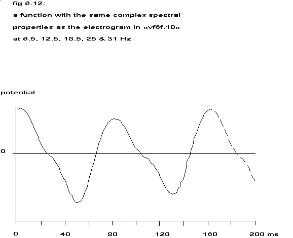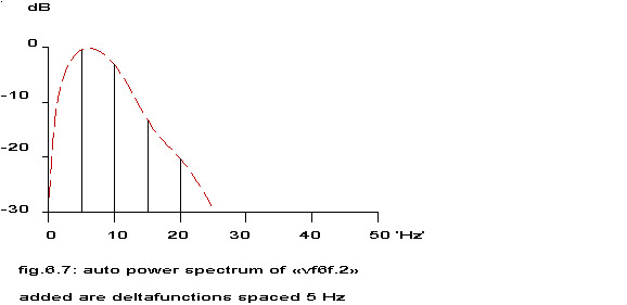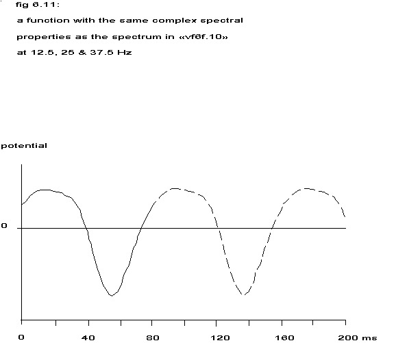 First of all nothing more has been stated than: if the above mentioned function is repeated regularly at intervals of 160 ms (375 pm) and a second identical function is formed with a 80 ms shift and the sum is formed of proper weight factors times the temporal second derivatives of these two repeated functions, then this sum will have a power spectrum like the one in fig. 6.10, but many other functions will yield the same spectrum, as only information of the frequency components of 6.25, 12.5, 18.75, 25, 31.25 and 37.5 Hz is available.
