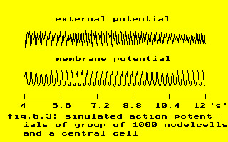 fig.6.3: simulated actionpotentials of a group of 1000 modelcells and the central cell