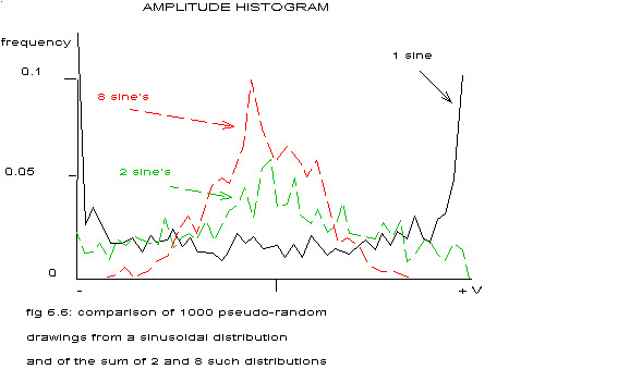 fig 6.6: comparison of 1000 pseudo-random drawings from a sinusoidal distribution and of the sum of 2 and 8 such distributions