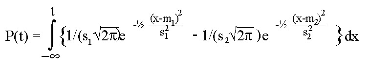P(t) is drawn for m1=30, s1=10, m2=65 and s2=15.
