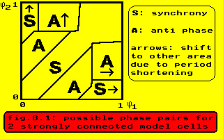 The result of the preceding paragraph is valid for all strongly connected cells in the aggregate of 1000 cells. The cells with equal phase do not really influence each others period, whereas the cells with a stable phase difference stimulate each other to a higher repetition frequency. This means that the phase difference between a fast and a slow cell is not constant, in other words if the phase difference lies in area A of fig. 8.1 the slow cell is speeded up and if the phase difference lies in area S then after a few cycles the phase difference enters an A area and the slower cell is also speeded up. Two strongly connected cells can be speeded up by their respective neighbours and have the same phase, as they do not influence each others frequency in that case. The consequence of this reasoning is that in an aggregate of strongly connected cells the only stable modes are anti-phase and in-phase, as all other phase differences will lead at some distance in time to unstable differences. The model of chapter V is more complicated, because also weak connections are present, but the result of eq. 6 remains the same if one cell with strong connections is replaced by several synchronous cells with weak connections.